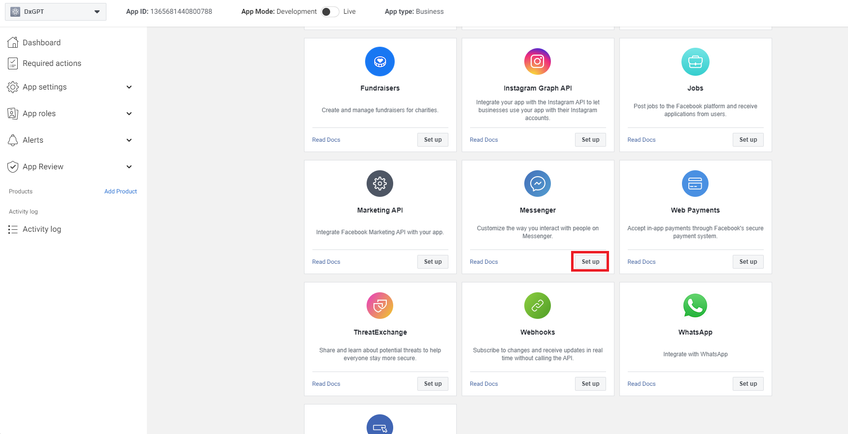 Clicking on “Add Product” on the left sidebar will open a page with many options. Under Add products to your app, select “Set Up” for Messenger.