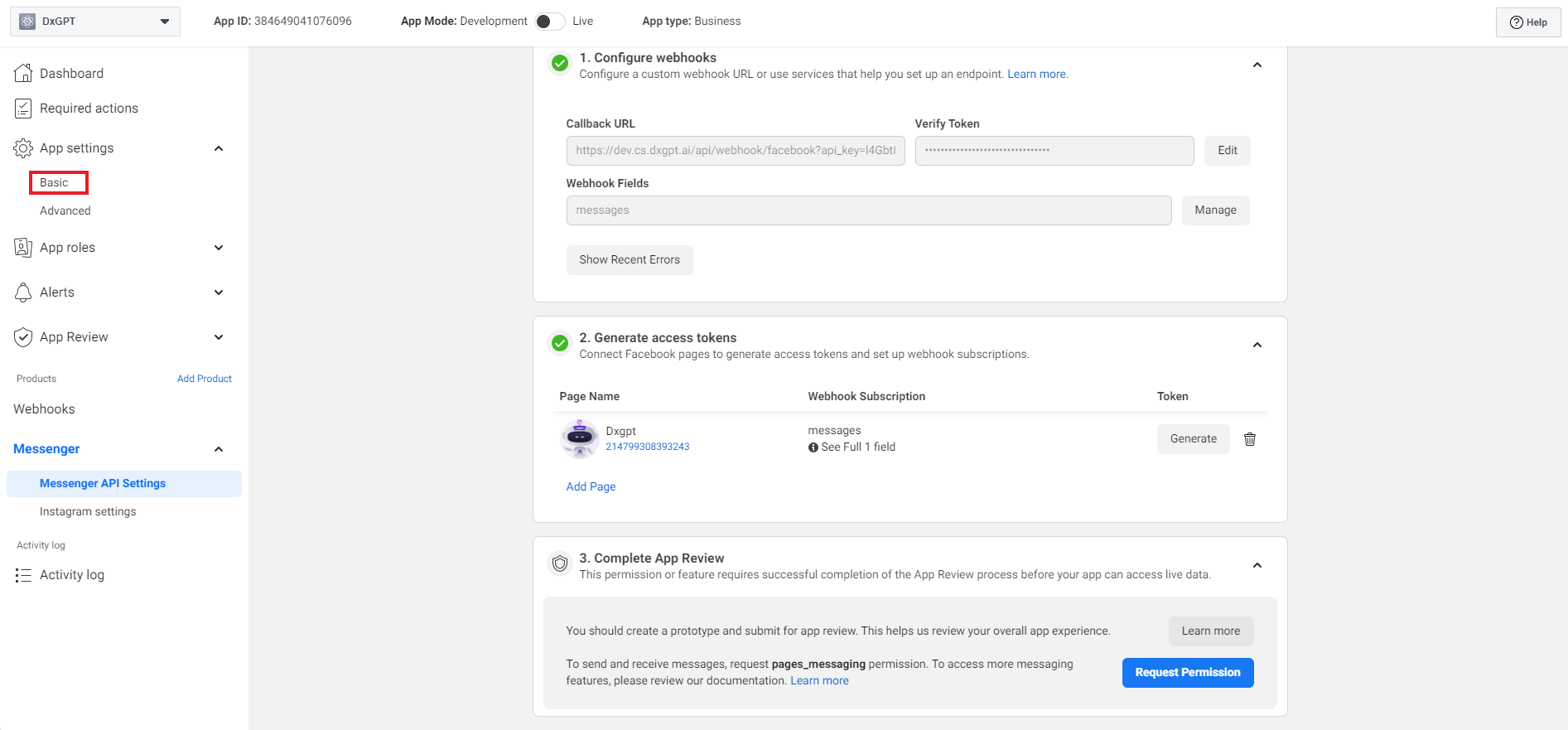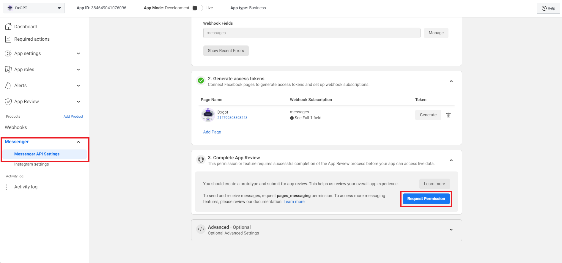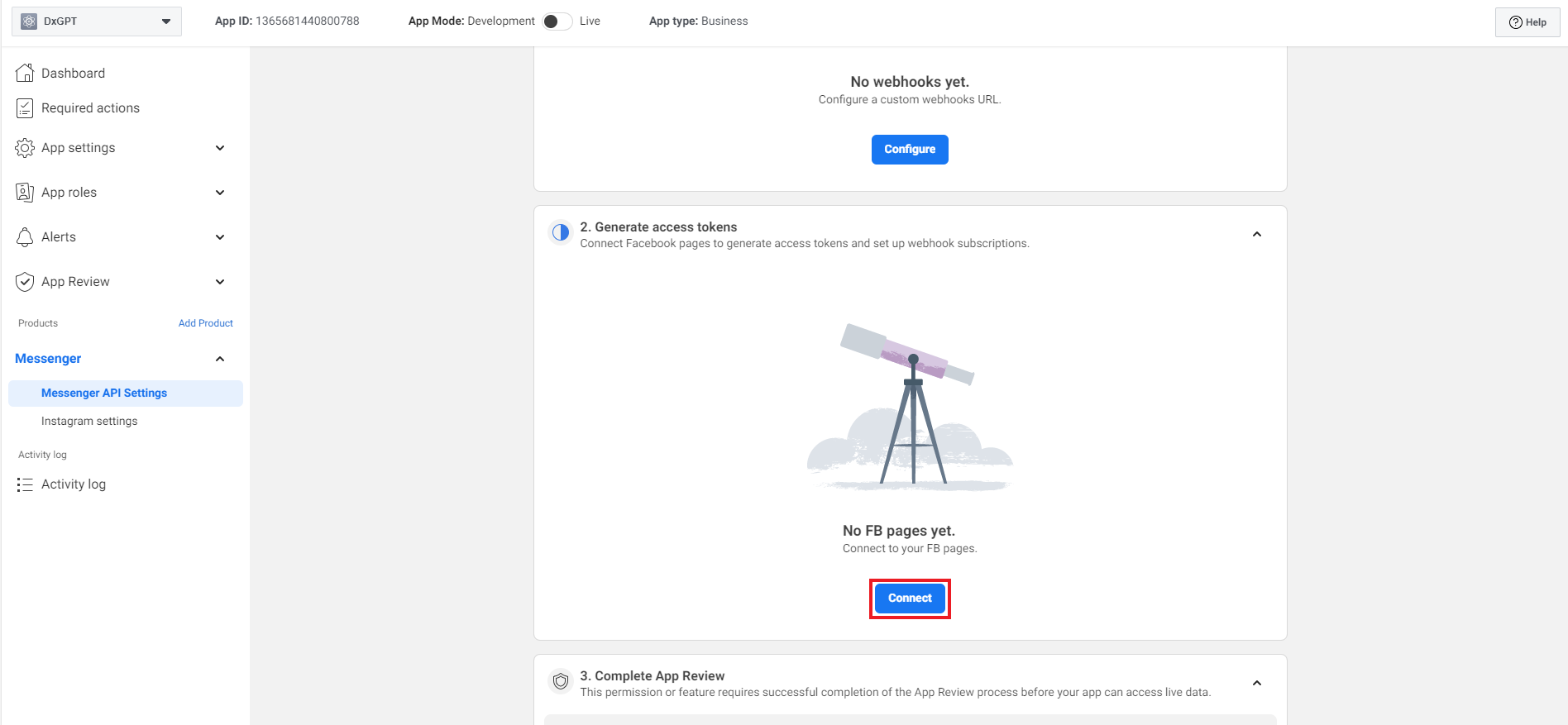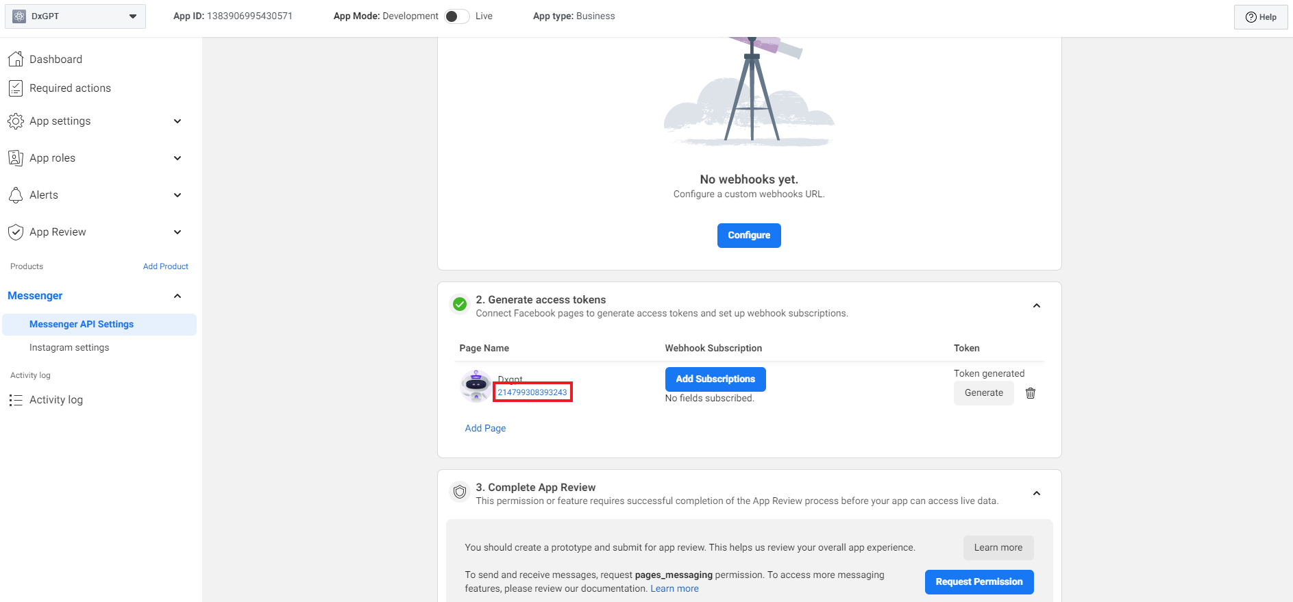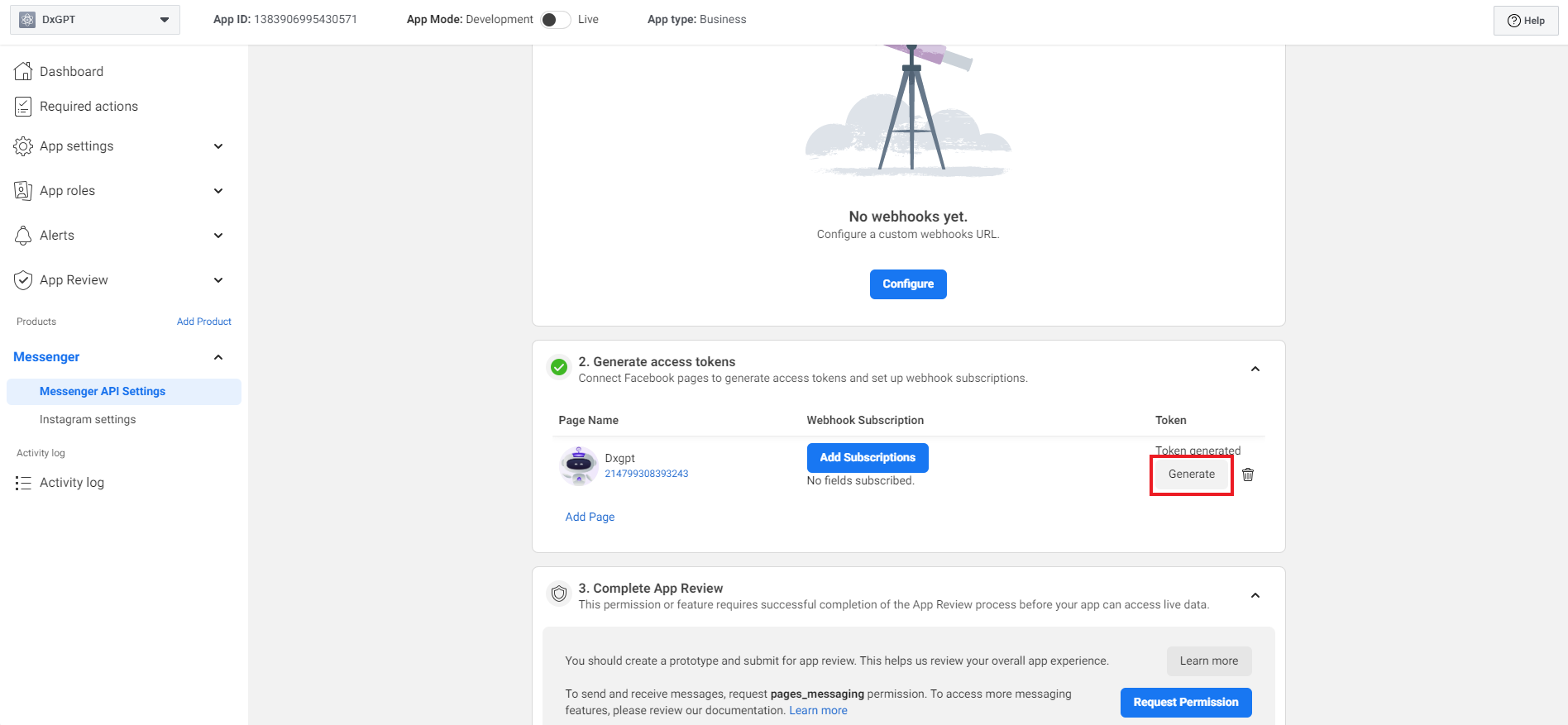 Your Facebook app is created, and now you need to connect your Facebook page to the app. For that, you need to generate a Page Access Token.