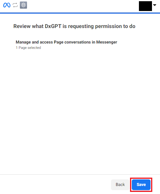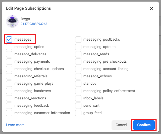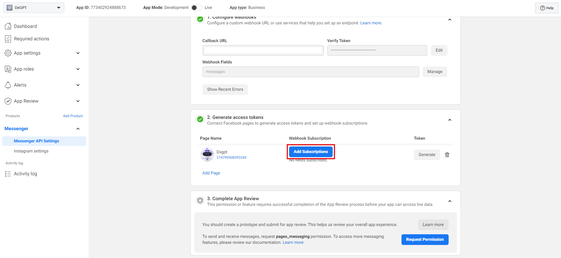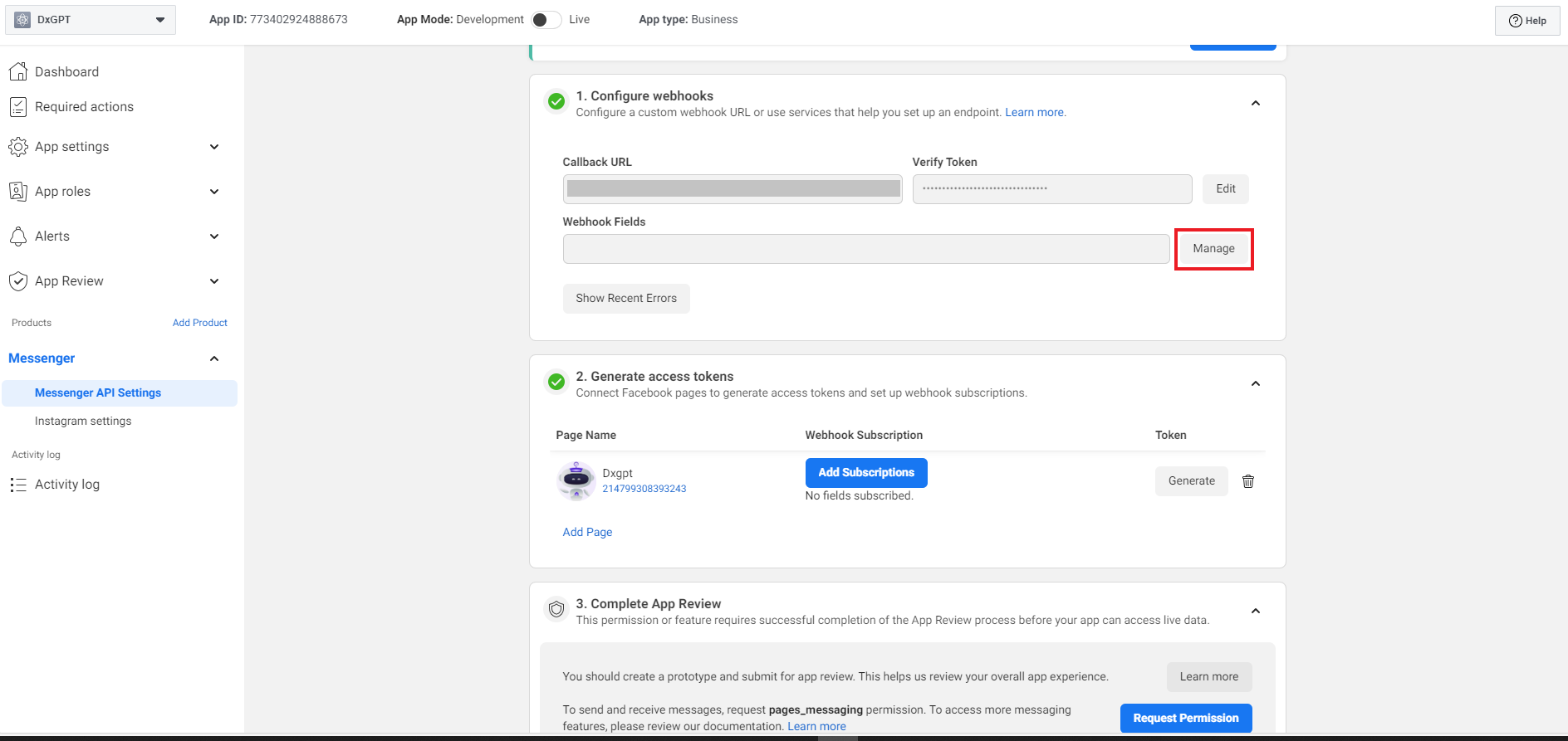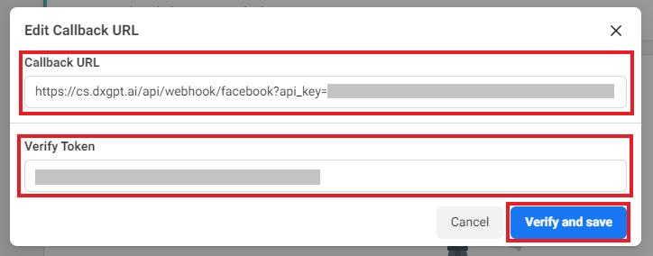 Provide “Callback URL” (link webhook in DxConnect App) and “Verify Token” (api_key in link webhook), then click on the “Verify and save” button. You’ll have to go through a security check to connect AI Assistant.