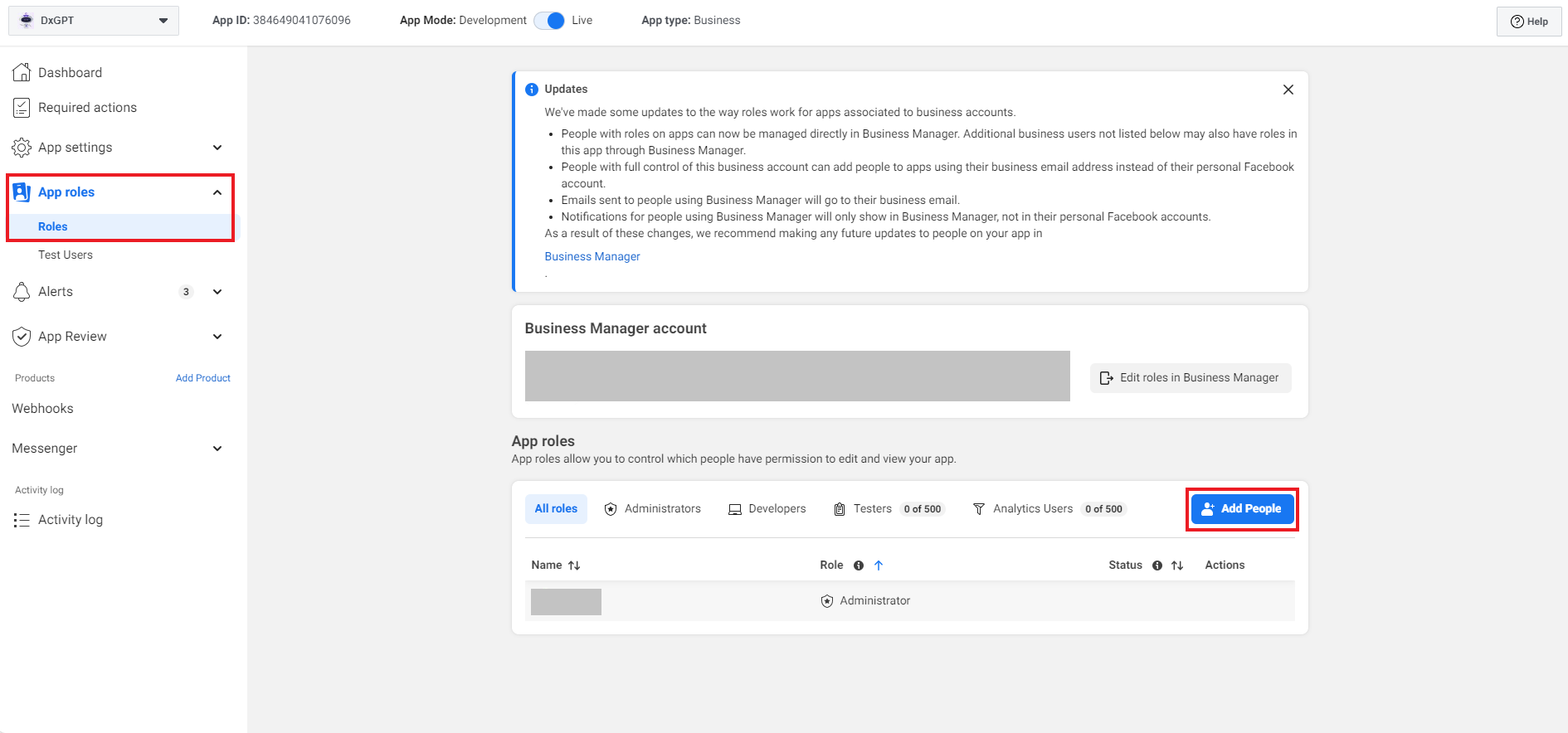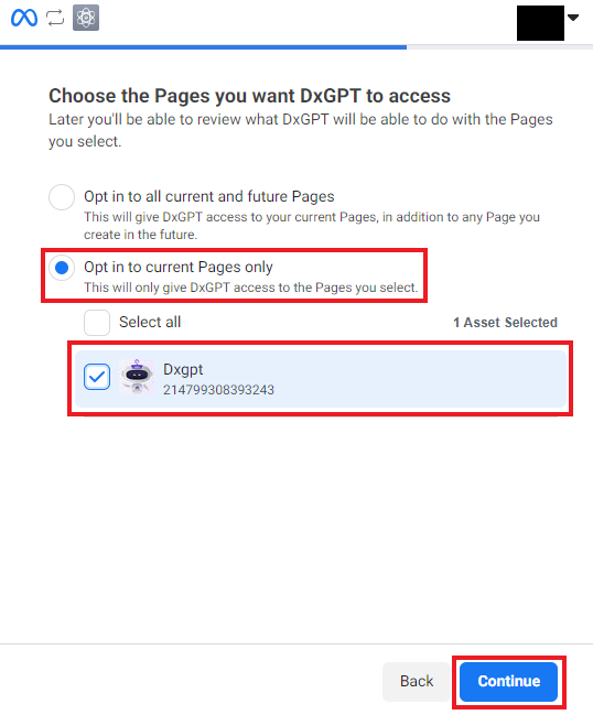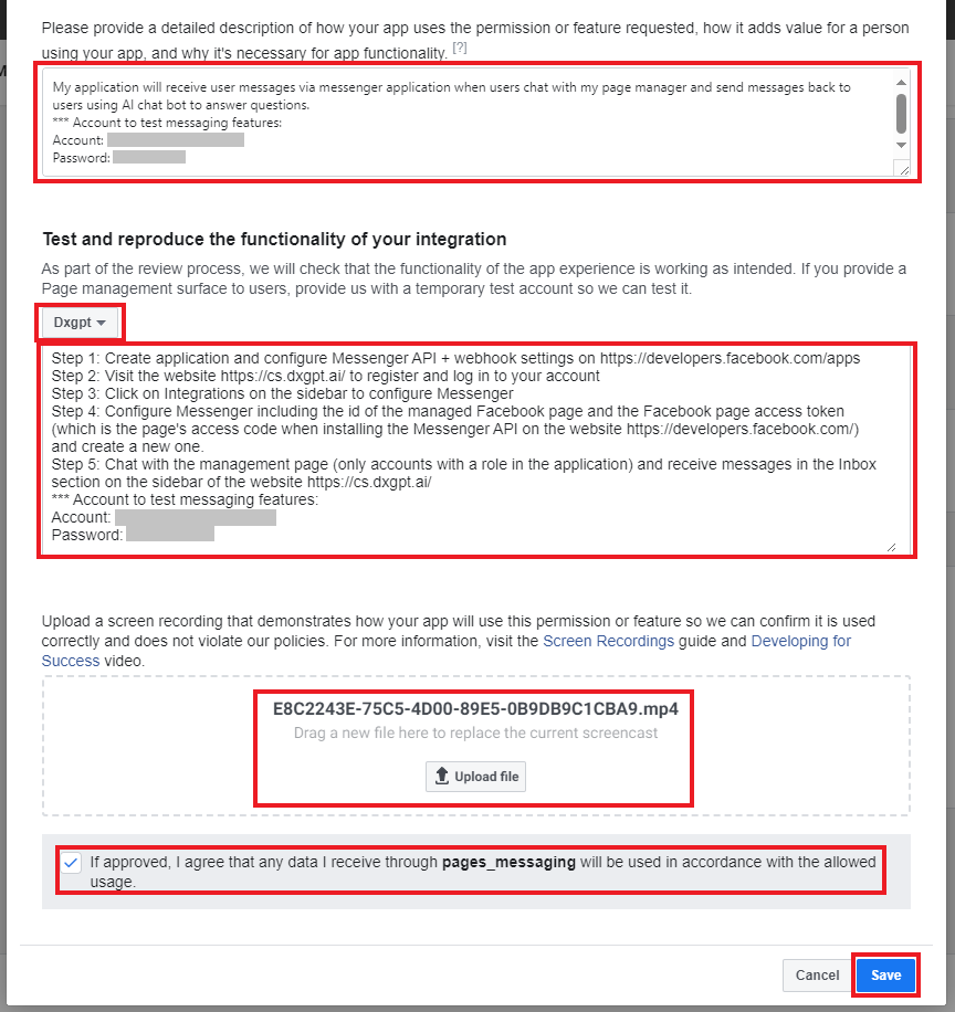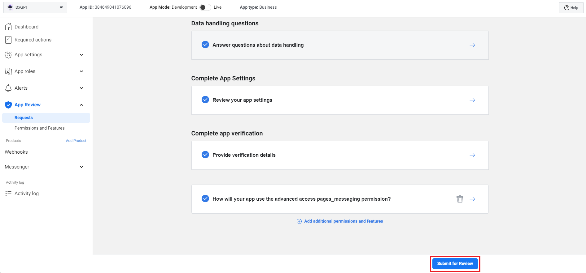 Provide “Callback URL” (link webhook in DxConnect App) and “Verify Token” (api_key in link webhook), then click on the “Verify and save” button. You’ll have to go through a security check to connect AI Assistant.