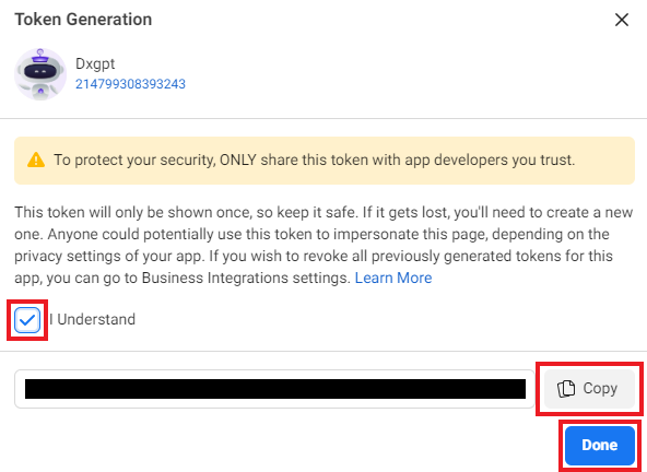 Click on “I Understand” checkbox, then click on the “Copy” button to copy facebook page access token and click on “Done” button.
