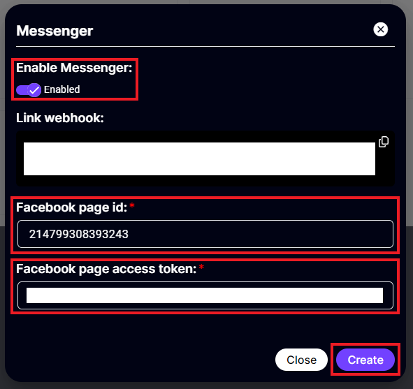 Click on “Enabled” and provide "Facebook page id" and "Facebook page access token", then click on the “Create” button. Your link webhook will work.
