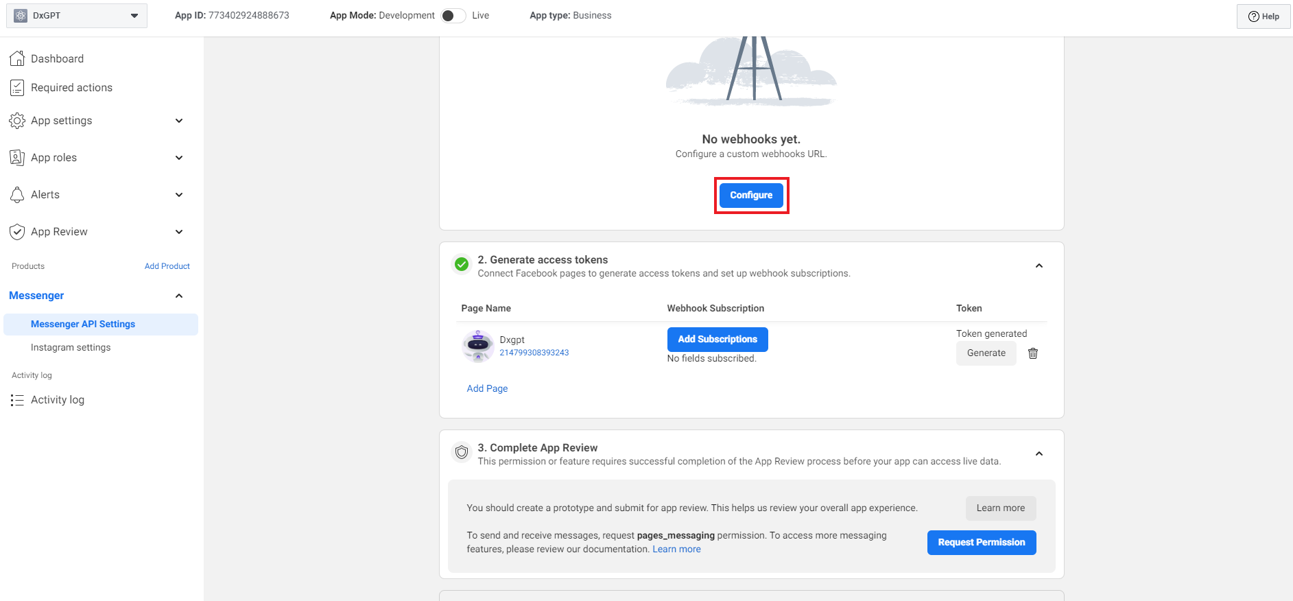 Clicking on “Messenger API Setting” on the left sidebar will open a page with many options. Under Messenger API Setup to your app, click on “Configure” button.