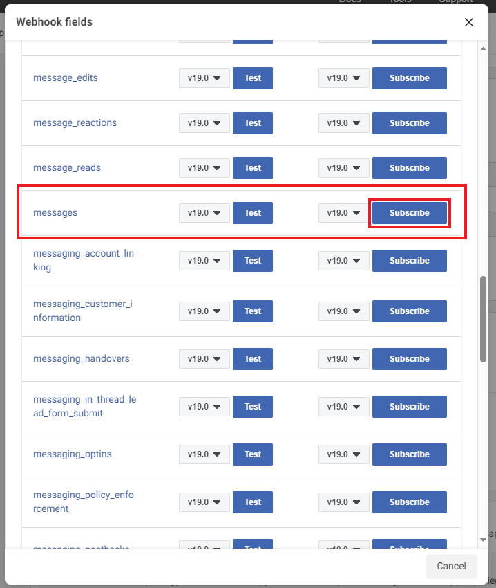 Under Webhook fields, select “Subscribe” button in “messages” and "feed" row, it will change to “Unsubcribe” button, then click "Cancel" button.