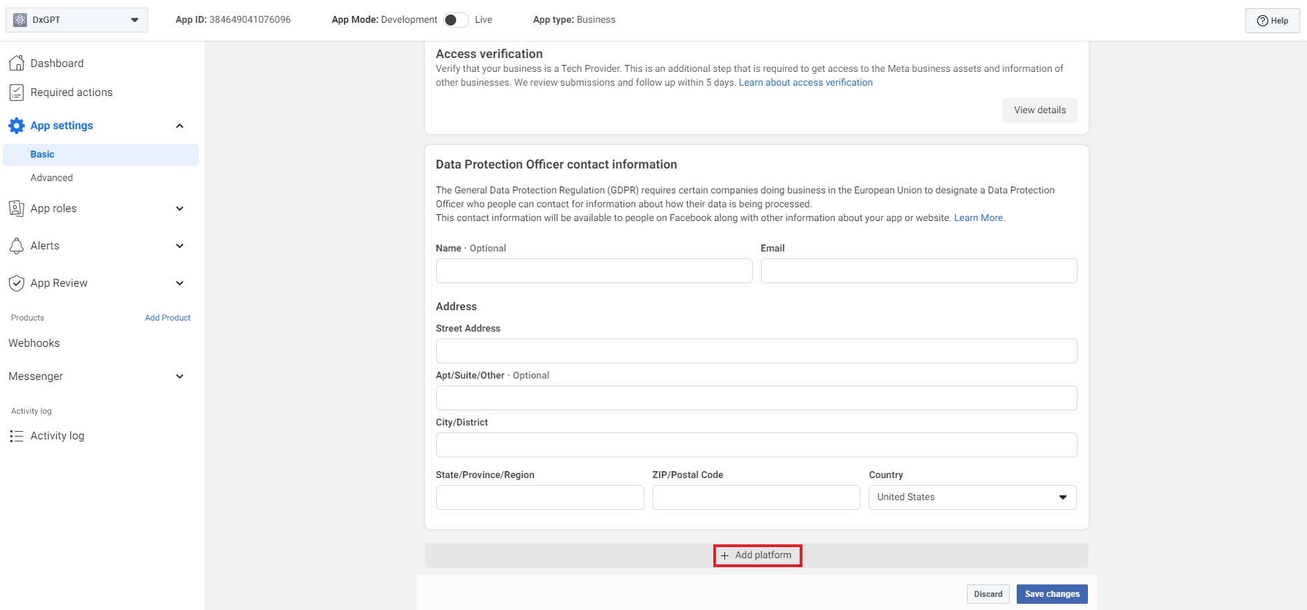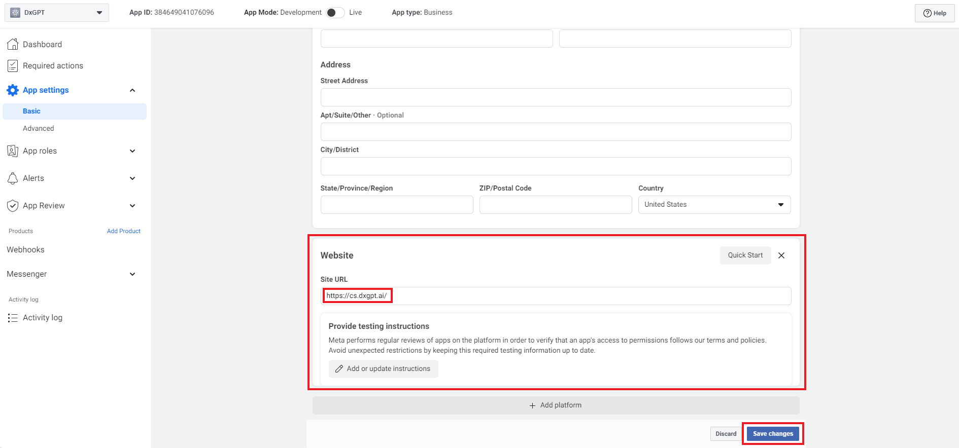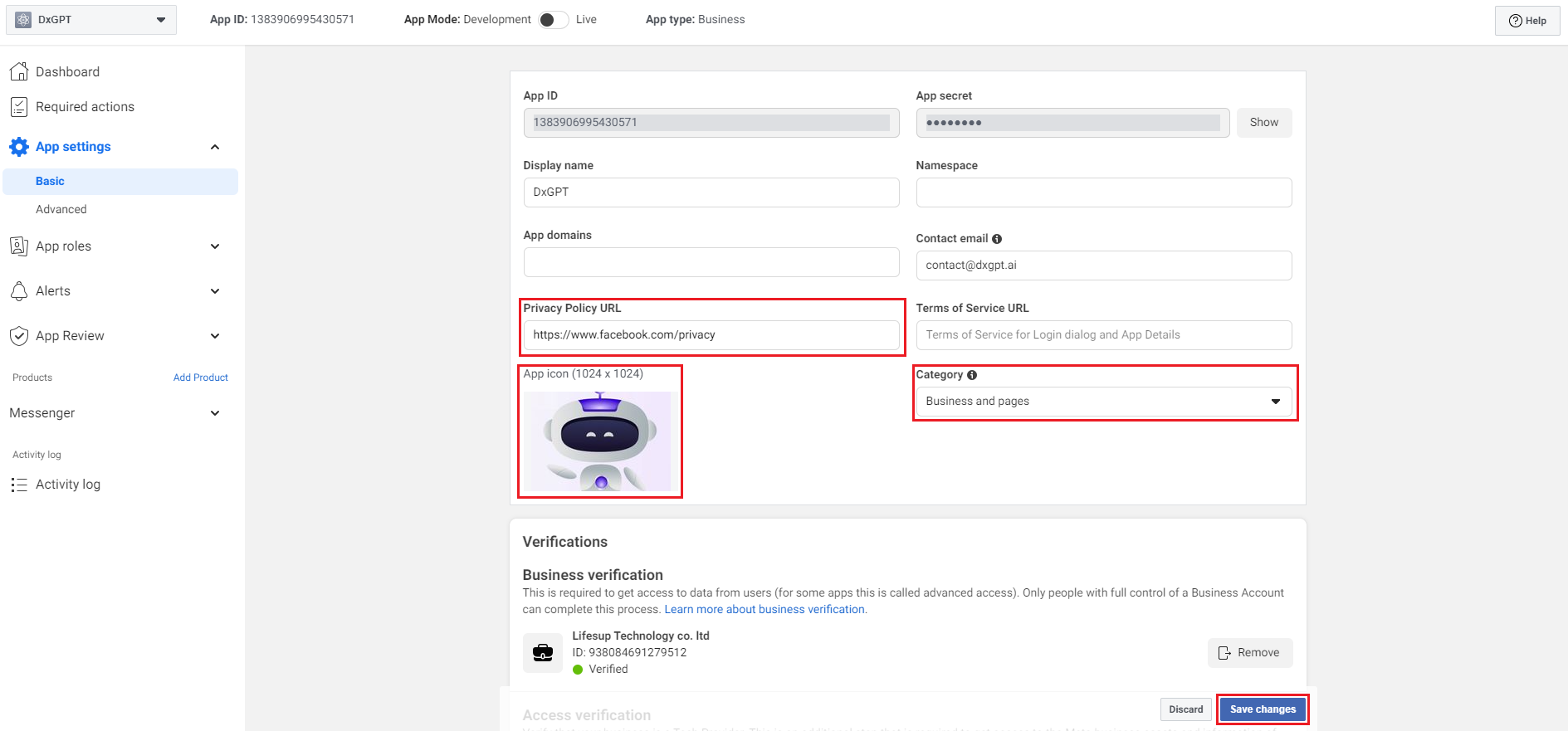 Provide “Privacy Policy URL”, “Category” and “App icon”. Clicking on “Choose a Category” will open up a popup where you can select the appropriate category of your app. Choose “Business and pages”. Then click on “Save Changes” to save the settings.