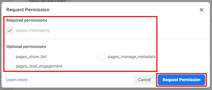 Now, the last step in the configuration is to public the Facebook App. To do that, browse to ”Messenger API Setting” of the page (from the left sidebar). Under Messenger API Setup, clicking on “Request Permission” button will open up the Request Permission popup.