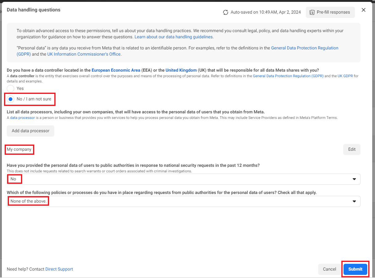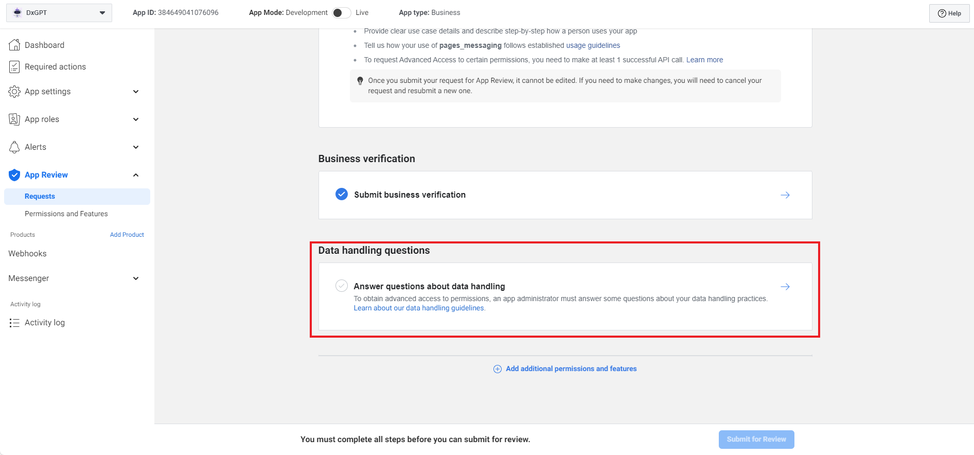 Under Request for App Review, clicking on “Data handling questions” will open up a popup.