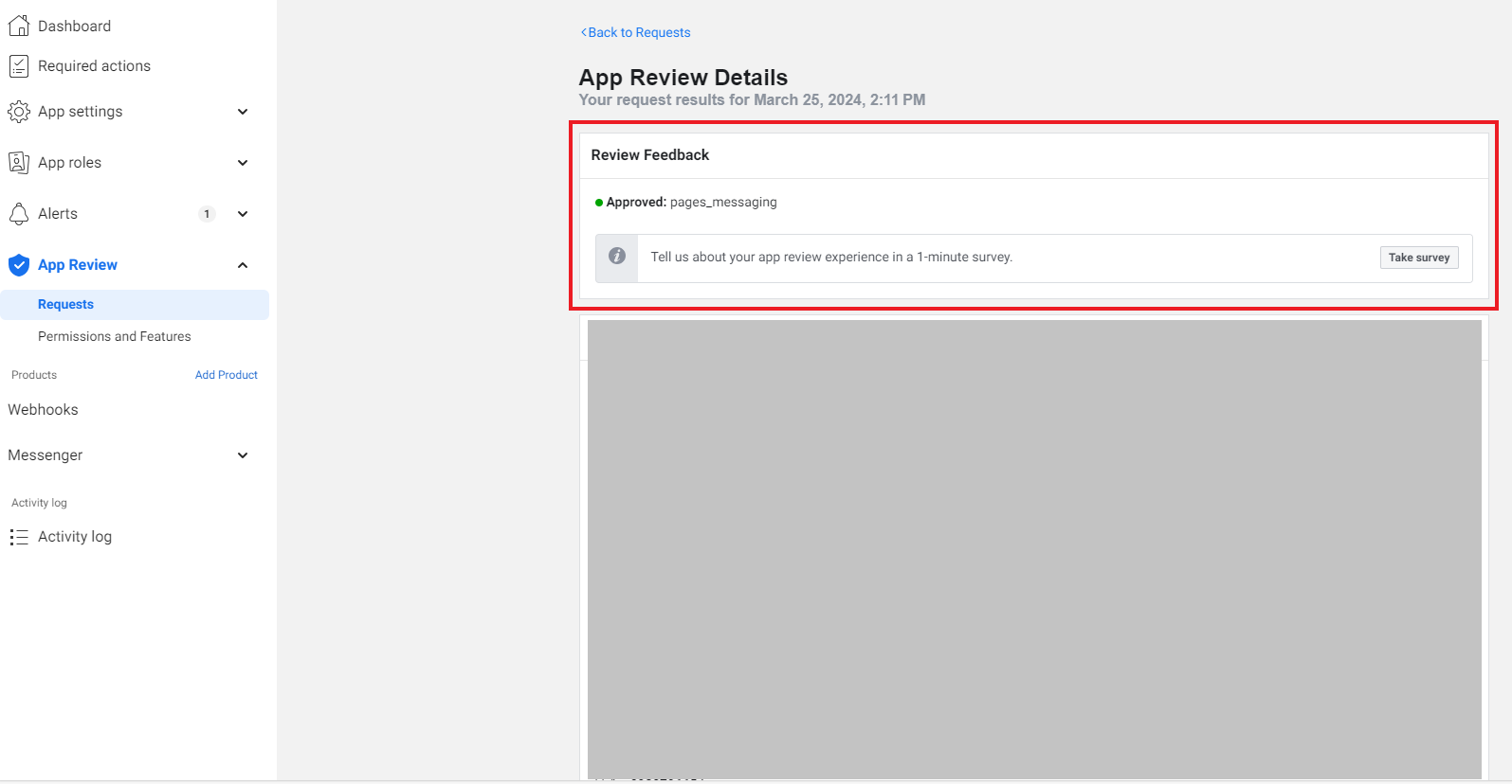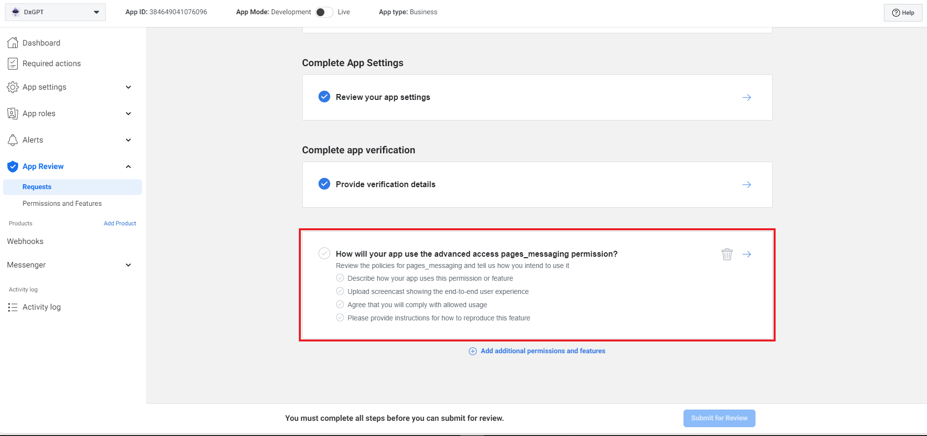 At the bottom of Request for App Review, clicking on “How will your app use the advanced access pages_messaging permission?” will open up a popup.