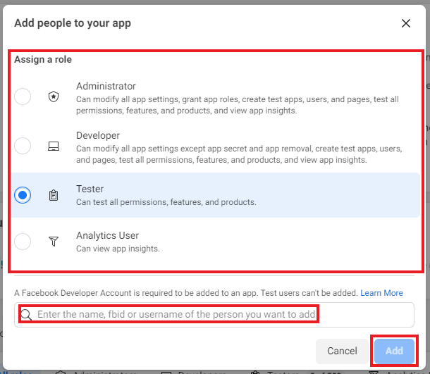 Select role for person and provide their ”Facebook ID” (or username or name), then click “Add” button. (Note: The person will accept into this app with the selected role at the link https://developers.facebook.com/settings/developer/requests)