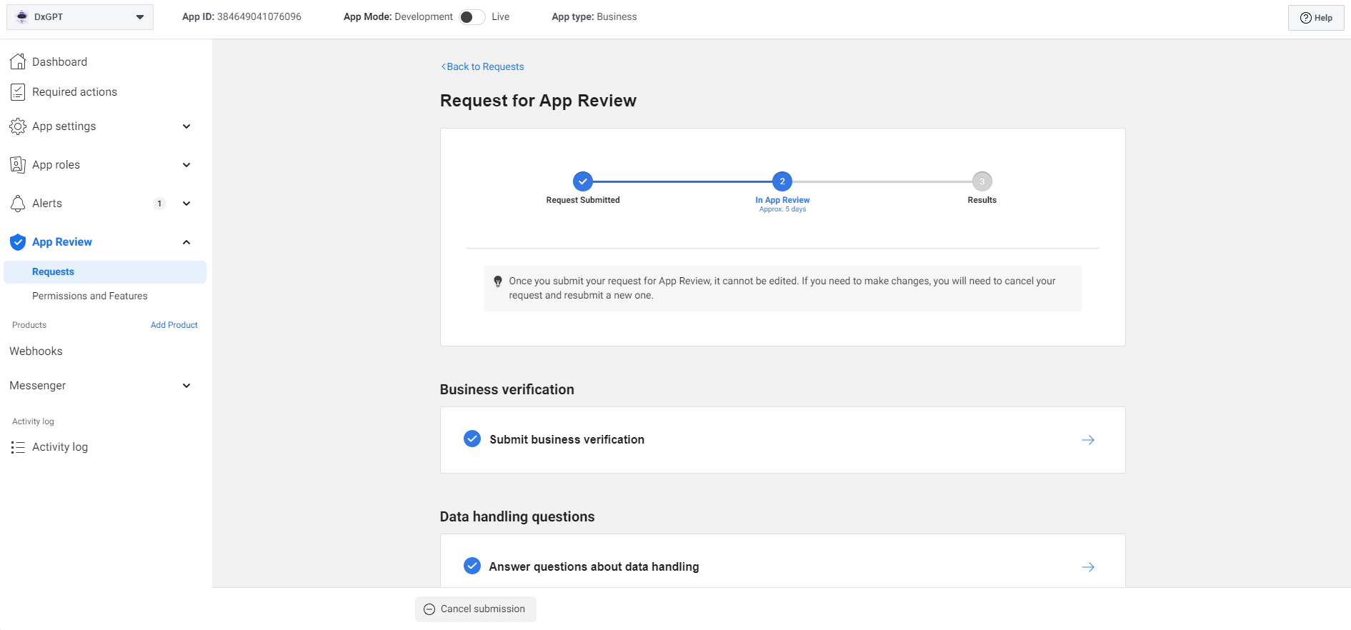 This is the view after submit, you have to wait about 5 days for Facebook to accept.